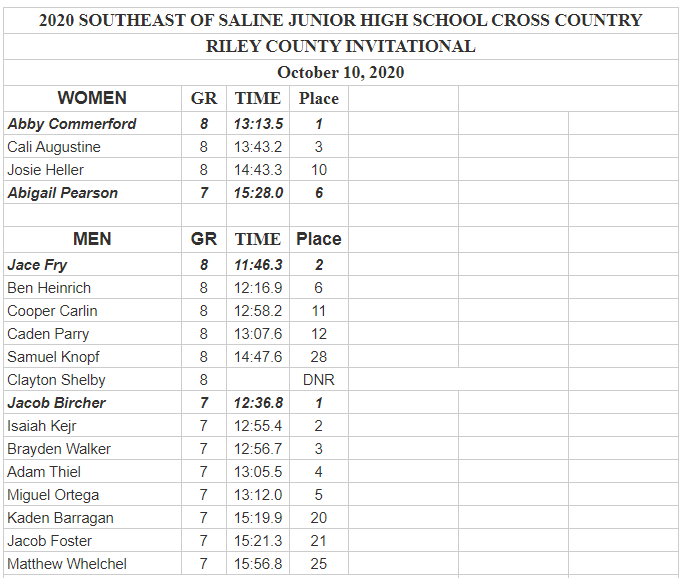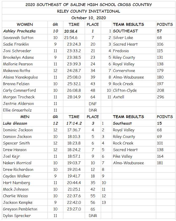 Southeast of Saline runners did well at the Riley County Invitational Saturday. Following are team and individual results as provided by Coach Wade Caselman.
