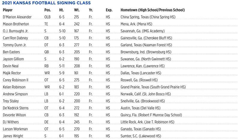 LAWRENCE — The Kansas Jayhawks introduced their 2021 signing class Wednesday on the first day of the early signing period, celebrating the 18 new members of their family.