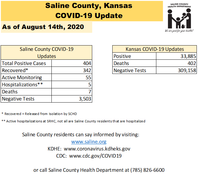 As of today, 342 of Saline County’s cases have recovered. We do have an additional 10 positive cases that have been identified since the Wednesday, August 12 report. The total for the county is now 404, with 55 cases that are actively being monitored by the Health Department, and a total of 7 deaths. Salina Regional Health Center last reported that they have 5 hospitalized COVID-19 patients. Salina Regional is a regional hospital, the COVID-19 patient total is not specific to the number of Saline County residents who may be hospitalized. Our dashboard is updated with the latest information.