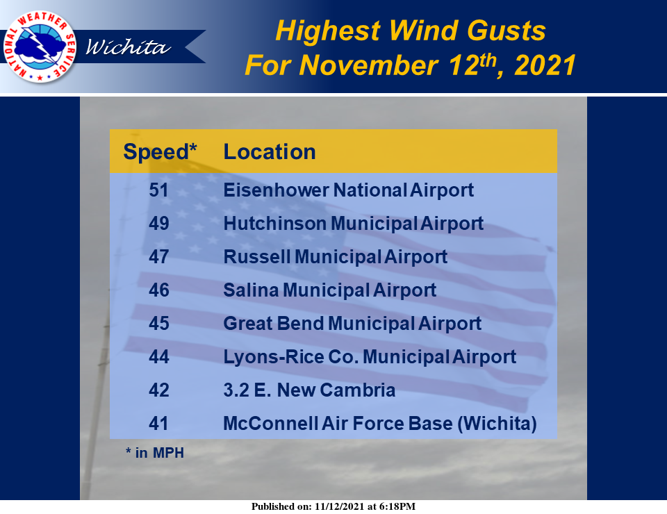 Here are the highest wind gusts recorded on this blustery Friday, according to the National Weather Service in Wichita: