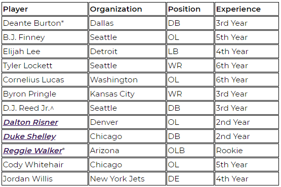Of the 12 players on NFL rosters, six are on offense and six are on defense. The longest-tenured former Wildcats are now Tyler Lockett (Seattle) and Cornelius Lucas (Washington) as both are entering their sixth season. They took over the spot previously occupied by Darren Sproles, who retired after his 15th season a year ago.