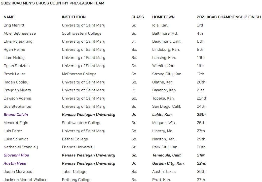 The Kansas Collegiate Athletic Conference has announced its 2022 KCAC Men's Cross Country Preseason Team. Kansas Wesleyan had three student-athletes earn spots on the team.