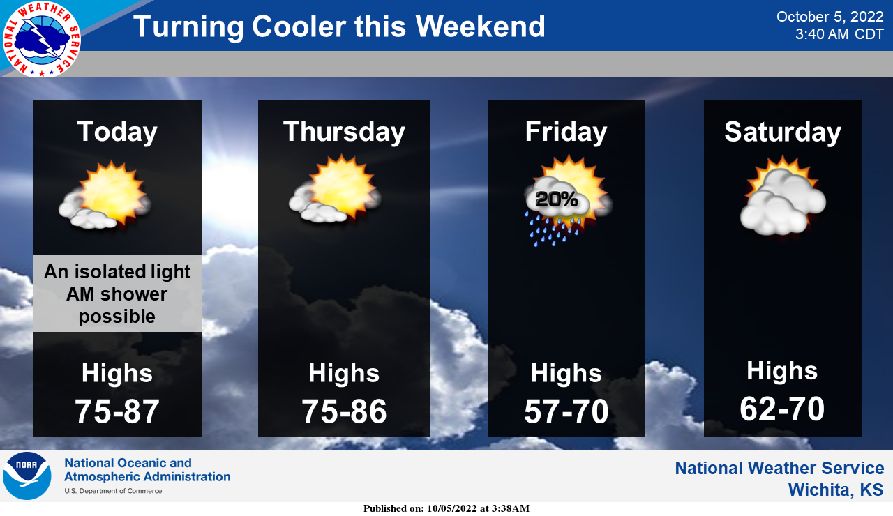 Thursday night, a cold front will move through the region and bring temperatures down significantly. Friday and Saturday will be much cooler with a chance for some light rain or drizzle across central Kansas.