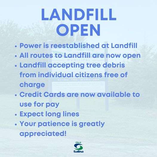 City Staff is outlining a plan to pick up limb debris curbside. Currently, resources are limited. If citizens are able, please bring tree limbs to the Salina Landfill. As City resources are freed, we will begin the pick-up process. The landfill is open and is accepting tree debris free of charge from individual residents. In addition, power has been restored to the landfill, so customers may now use credit cards. Customers should expect long lines at the landfill due to the number of customers hauling limb debris and should plan accordingly.
