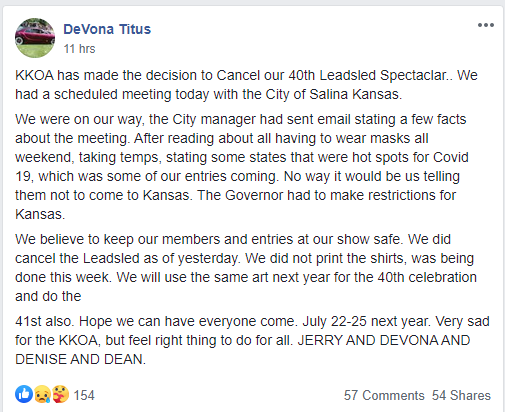 Kustom Kemps of America today announced on its Facebook page that the 40th Leadsled Spectacular has been canceled.