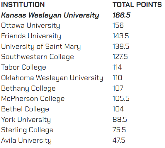 The Coyotes had 166.5 total points to lead the conference. Ottawa University finished in second place with 156 points, while Friends University rounded out the top three with 143.5 points.