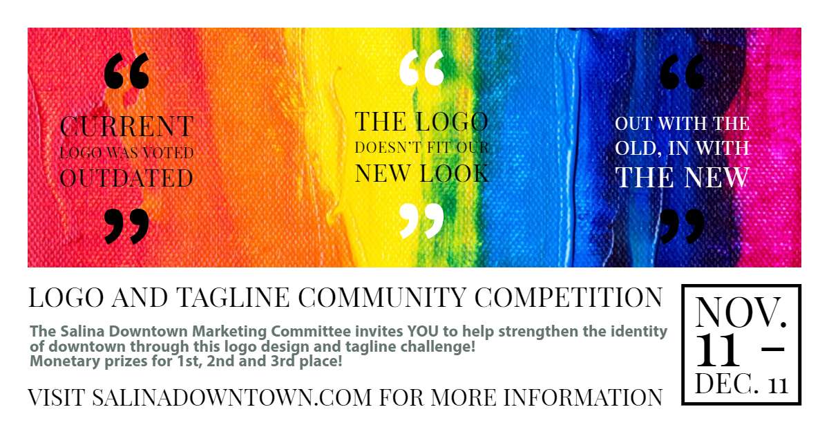 The Salina Downtown Marketing Committee invites all creative and artistic minds to help strengthen the identity of downtown through this logo design and tagline challenge! The marketing committee is focused on creating community and cultural connection by providing tools, encouragement, marketing ideas and resources through fellowship and education for and with our members. The winning logo and tagline will become Salina Downtown’s new identity for years to come. Help be a part of the change!