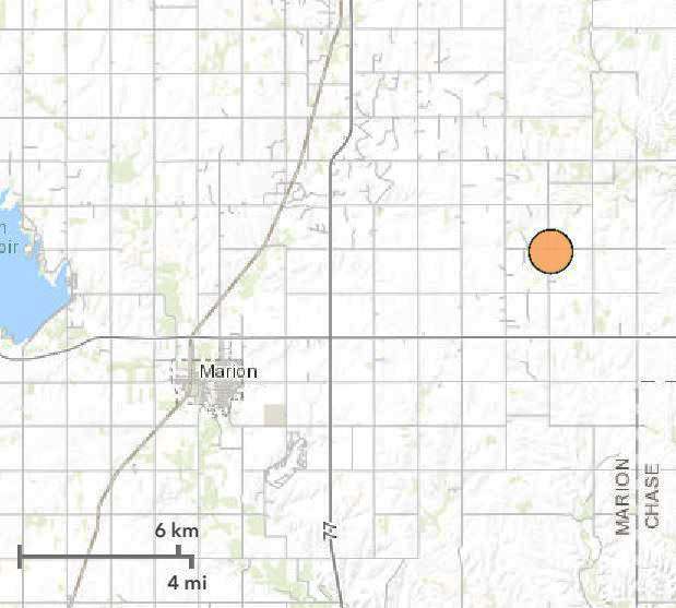 According to the Kansas Geological Survey (KGS, the first temblor, at 5:21 p.m. Monday, was a magnitude 3.3 quake. It was centered slightly less than eight miles east-northeast of Marion, just southeast of the intersection of Alfalfa Road and 220th Street.