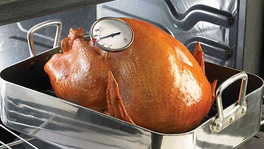 Use a food thermometer. The turkey should be cooked to an internal temperature of 165 degrees F. Don’t rely on a pop-up thermometer, which often is inserted only about 1 ½ to 2 inches. Blakeslee suggests testing for doneness in multiple spots, such as where the turkey leg meets the thigh, or perhaps in the breast area.