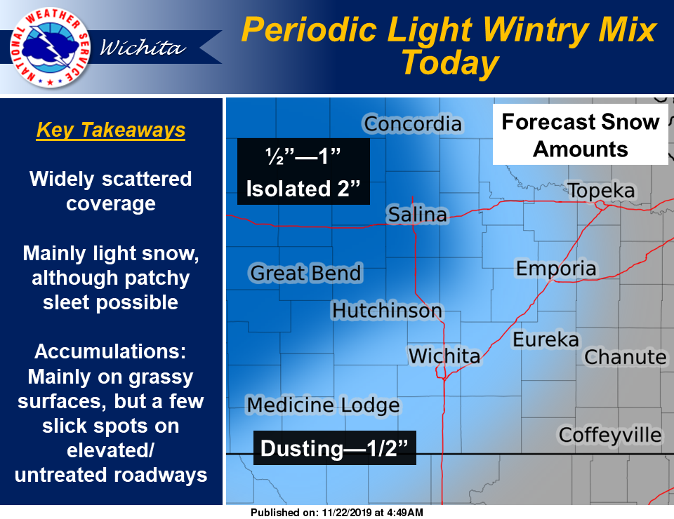 According to the National Weather Service (NWS) in Wichita, snow accumulations around 1 inch are likely across most of central Kansas while areas near Interstate 70 may reach closer to 2 inches. South-Central Kansas should receive less than one half inch.
