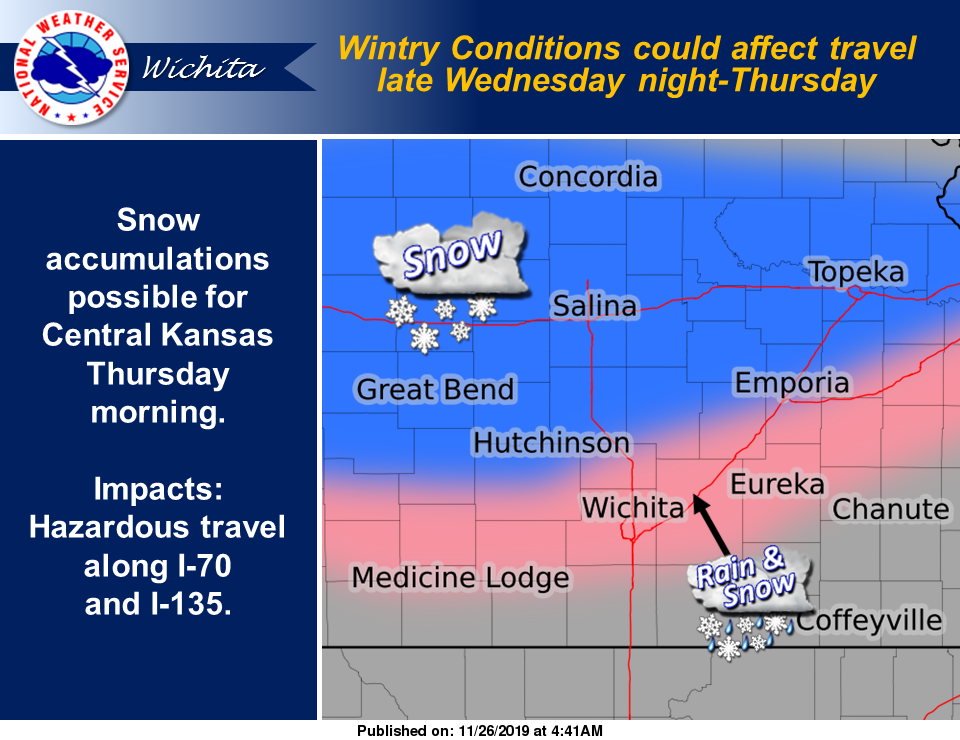 There's a better chance for snow or a rain-snow mix late Wednesday night through Thursday morning. At this time, central Kansas has the best chance for some snow accumulations, NWS noted. Lots of uncertainty exists with this snow chance, so persons with travel plans early Thursday should pay attention for later updates and possible advisories.