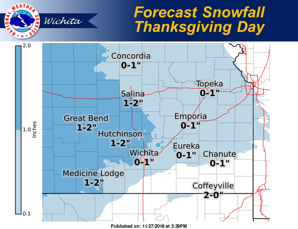 A light wintry mix is expected. Total snow accumulations of one to perhaps two inches especially across portions of central Kansas, NWS noted. A light wintry mix will develop during the early morning hours before transitioning to light rain and ending by late afternoon or early evening.