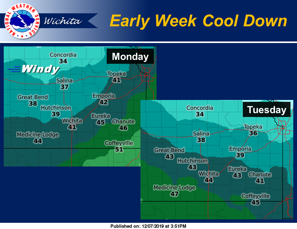 According to the National Weather Service (NWS) in Wichita, a strong cold front will usher in cooler conditions across the region for early this week, with daytime highs in the 30s and 40s.