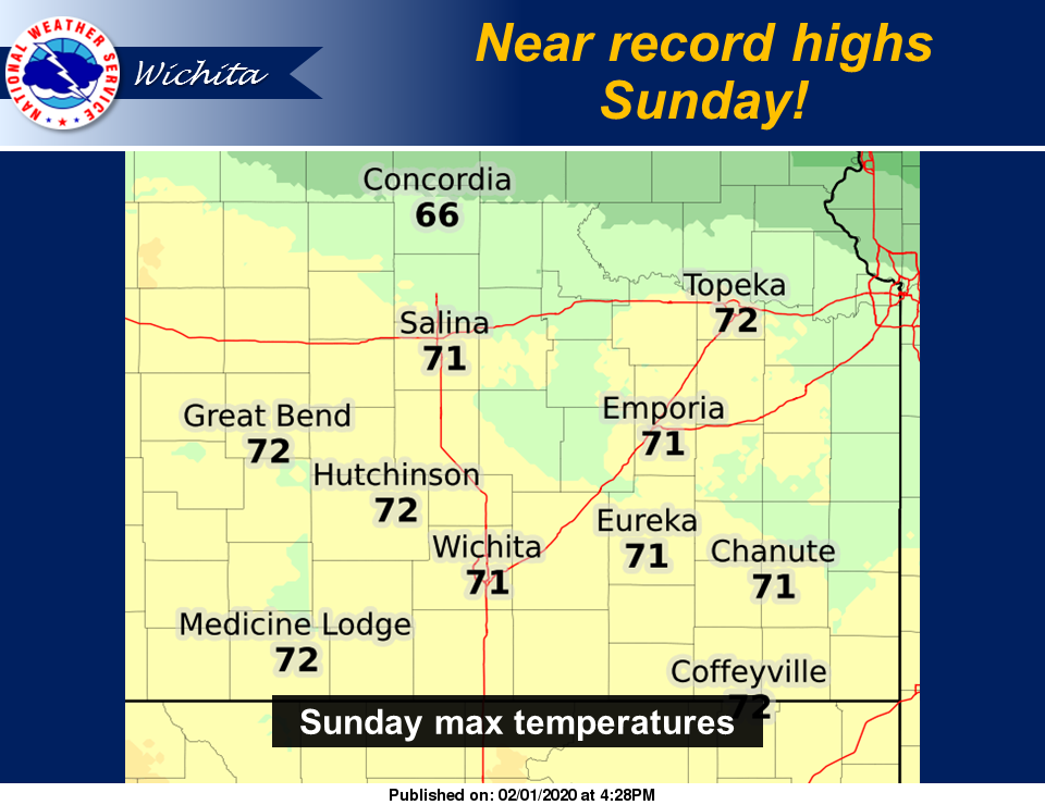 According to the National Weather Service (NWS) in Wichita, high temperatures Sunday are expected to be more than 20 degrees above normal as most locations top out around 70 degrees.