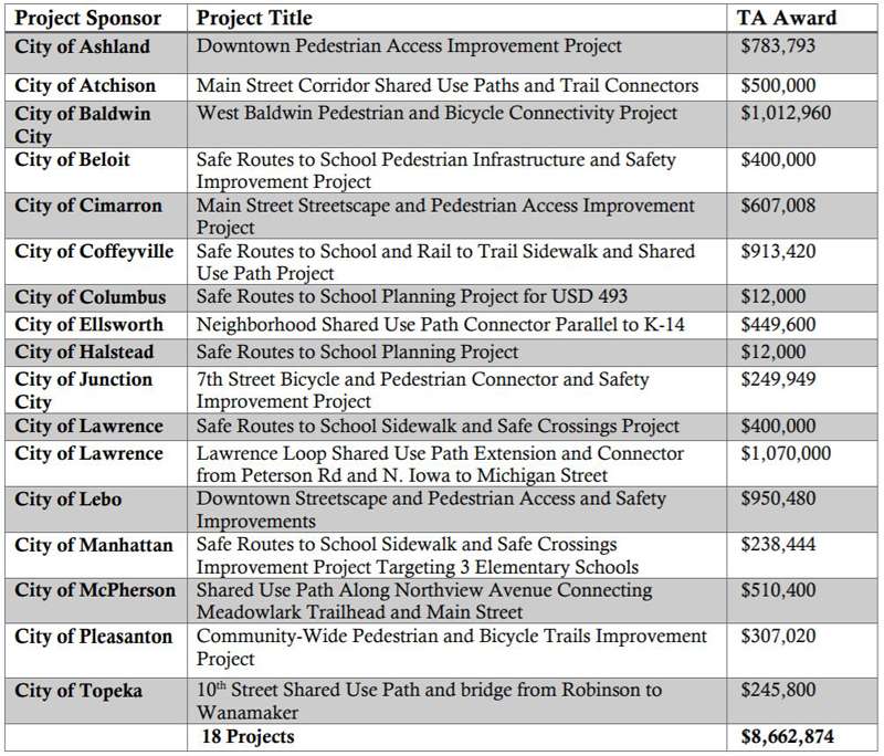 The Kansas Department of Transportation (KDOT) has awarded $8.6 million for the 18 projects selected for inclusion in its Transportation Alternatives (TA) program for Federal Fiscal Year 2021.