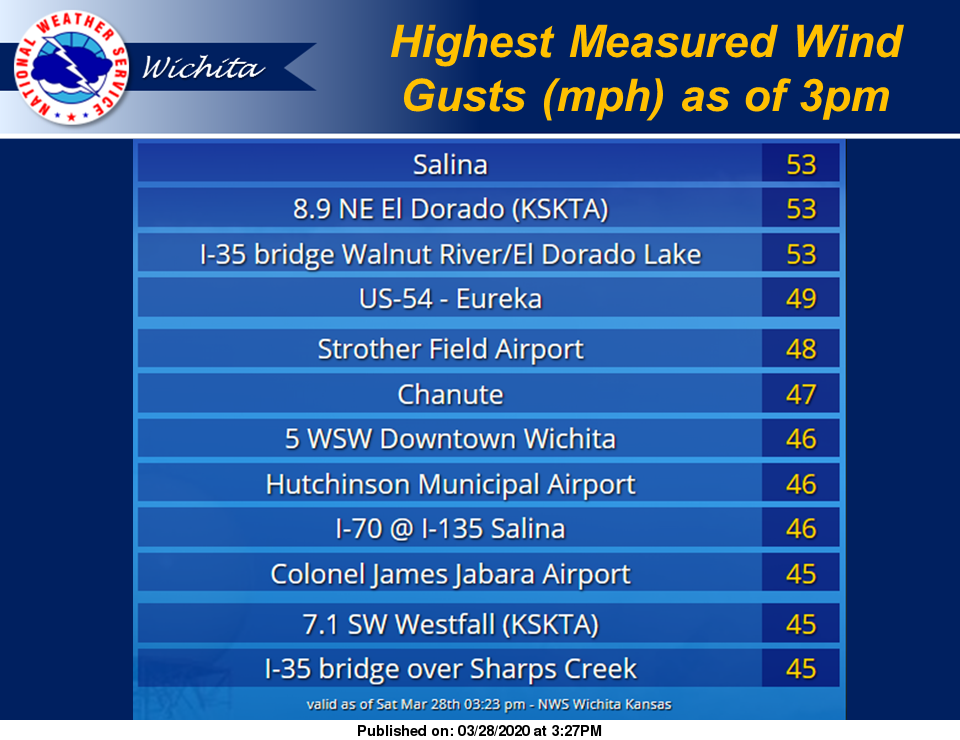 Here is a look at some of the highest measured wind gusts -- as of 3 p.m. -- across central, south-central, and southeast Kansas from the National Weather Service in Wichita.