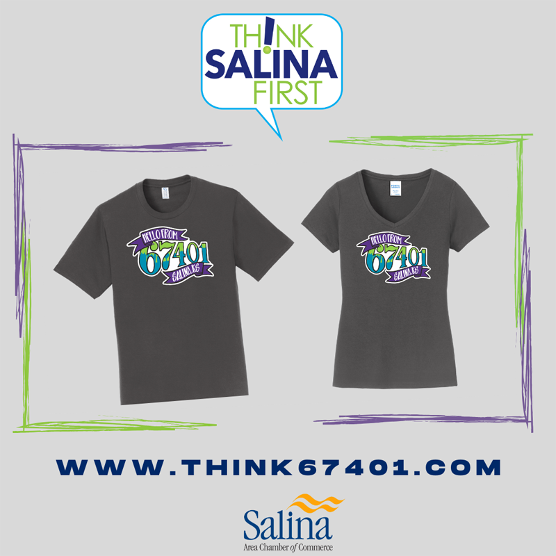 Ultimately, the Think67401 shop will feature various products depicting messages and artwork from the Chamber. This initial opening of the shop exclusively features one very special item, a T-shirt emblazoned with our 67401 Mural artwork, plus messaging to Think Salina First, and #salinastrong. The shirts will sell for $25 in standard sizes, plus optional shipping.