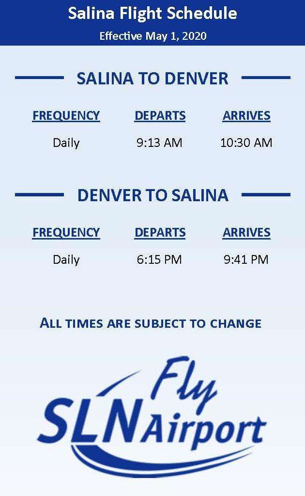 Passengers arriving at the Salina Regional Airport will be greeted by airline and TSA staff who now wear protective masks and gloves for passenger check-in, passenger screening and boarding. Passenger ticketing and screening podiums are equipped with sneeze guards. Arriving passengers will be required to wear face masks on the flight to Denver and beyond.
