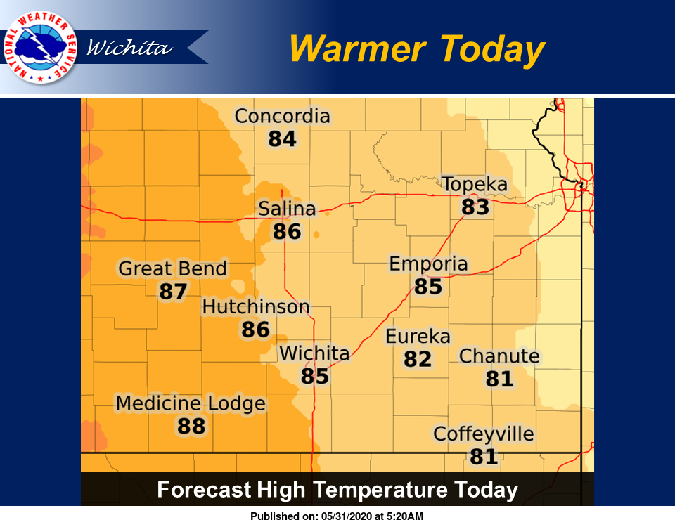 Forecast high temperatures are a bit warmer today across the western half of the area, but similar to Saturday across the east, according to the National Weather Service (NWS) in Wichita. Forecast highs range from near 80 along the Missouri border, to the upper 80s across the middle of the state.