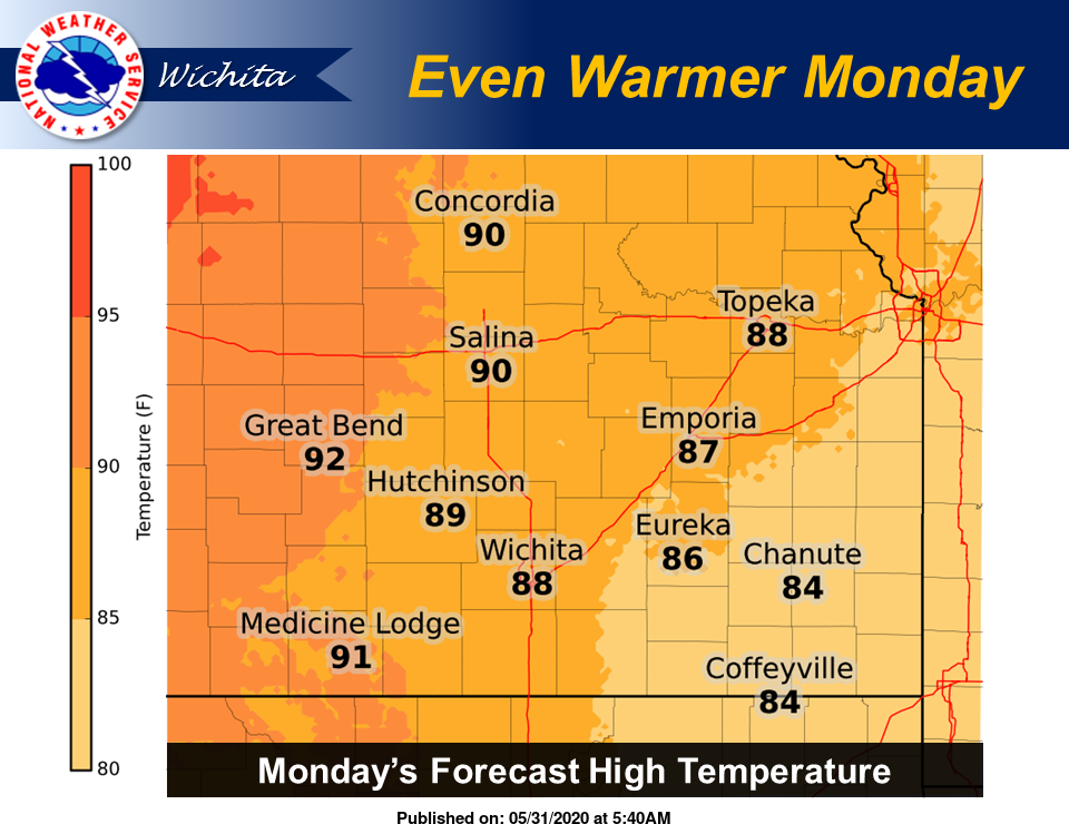 Forecast high temperatures on Monday will be even warmer, ranging from the mid 80s in southeast Kansas to the lower 90s in parts of central Kansas, NWS noted.
