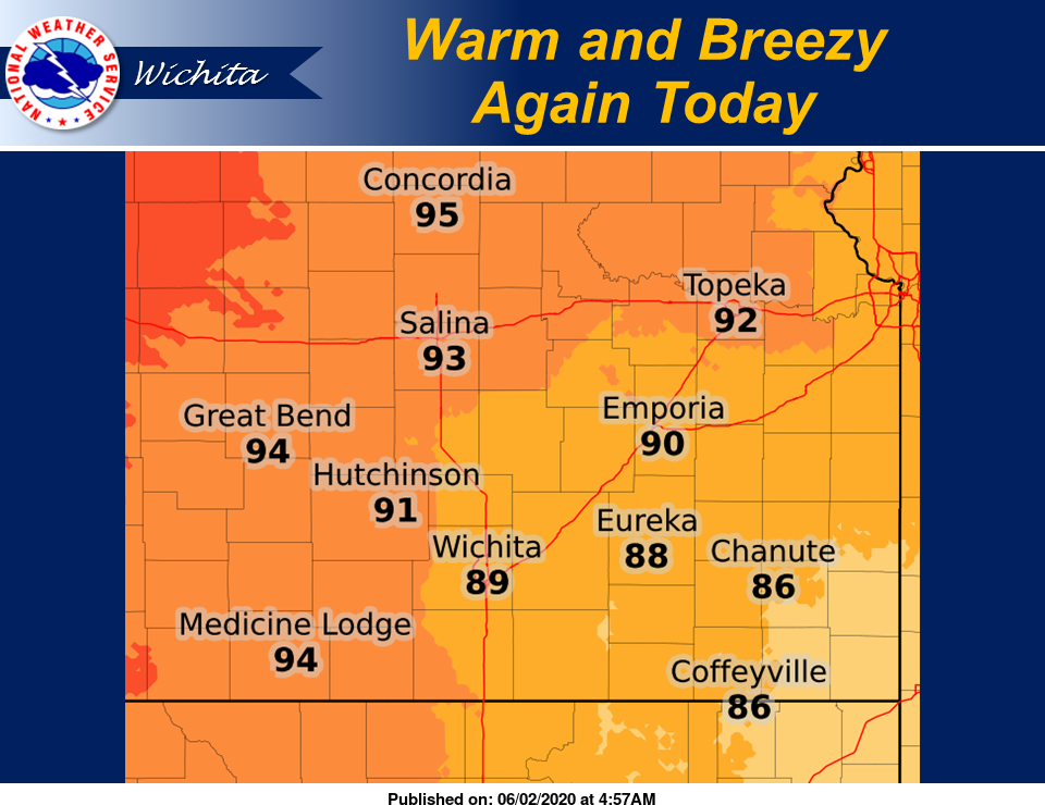 Today is expected to be warm and breezy across central, south central, and southeast Kansas. High temperatures are forecast to reach the mid-90s in some places, according to the National Weather Service (NWS) in Wichita.