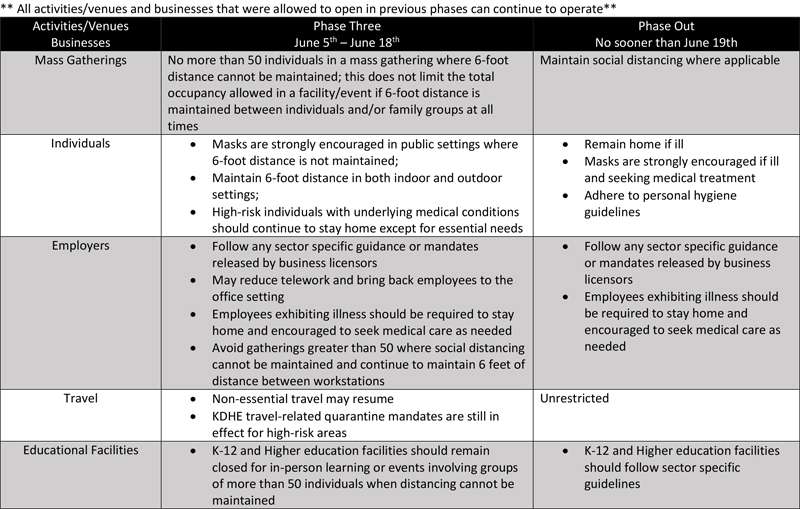 It was determined that a phased approach to reopening would be best for the county, with emphasis on data being used to determing further reopening. Tiller told commissioners that data used included more than just case numbers. He said that testing rates need to increase and the percent of positive results from testing, as well as the number of deaths, needs to continue to be low. Additionally, the number of COVID-19 hospitalizations at Salina Regional Health Center also is a factor because people from other counties who are hospitalized at SRHC could affect healthcare resources available to Saline County residents, the county information noted.