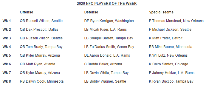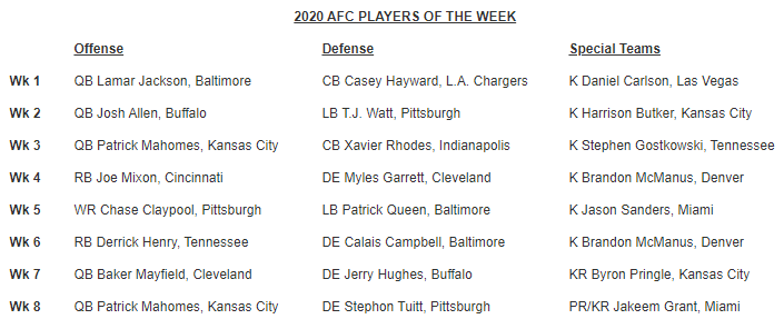 According to the National Football League (NFL), Mahomes, defensive end Stephon Tuitt of the Pittsburgh Steelers, and punt/kick returner Jakeem Grant of the Miami Dolphins are the AFC Offensive, Defensive and Special Teams Players of the Week for games played in Week 8 (Oct. 29, Nov. 1-2).