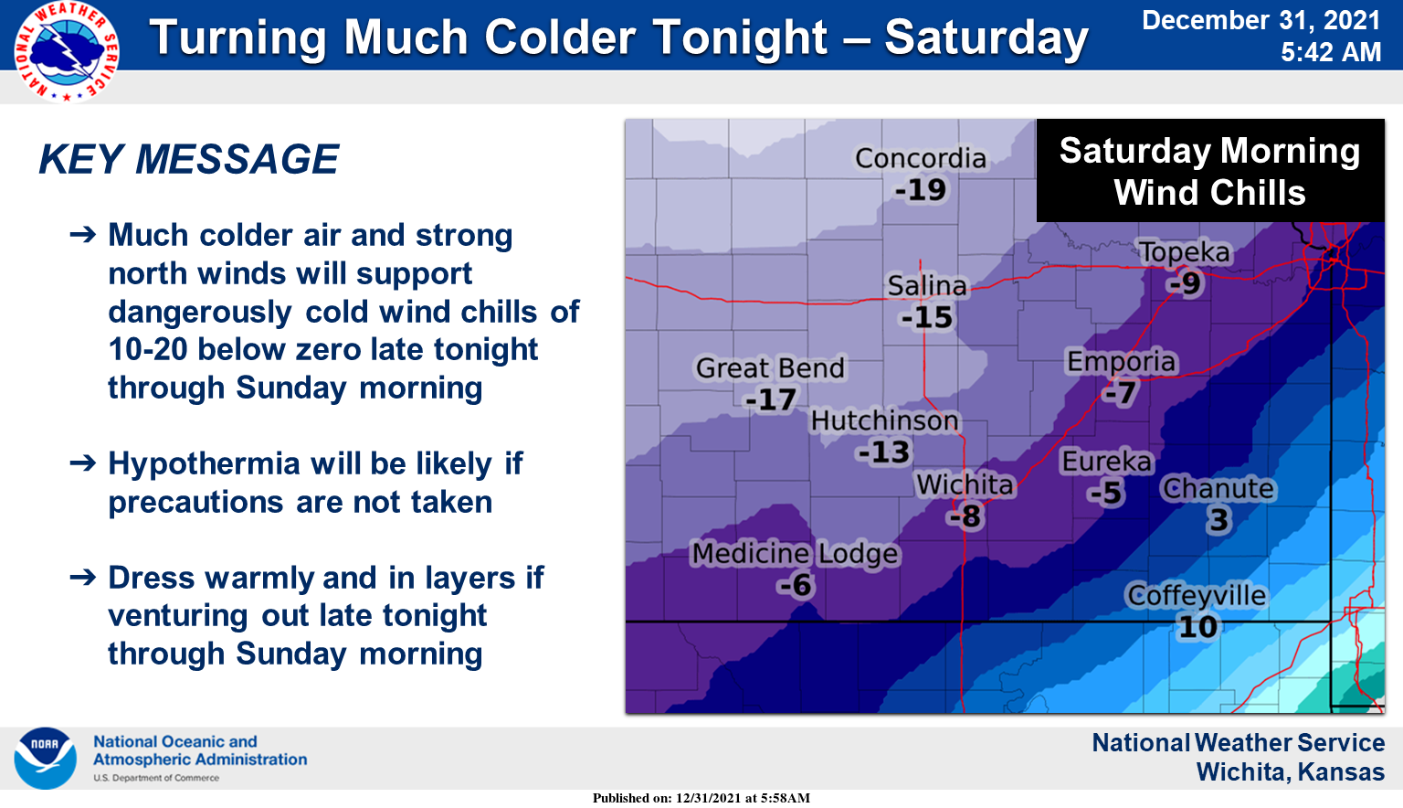 Very cold wind chills Saturday and Saturday night could be dangerous for vulnerable populations and those that may become stranded in their vehicles. Slow down and use caution while traveling.