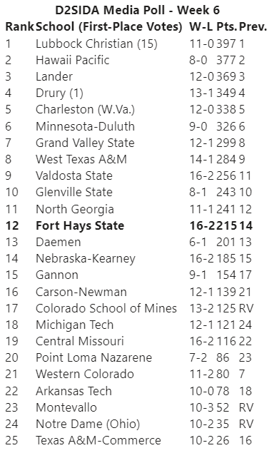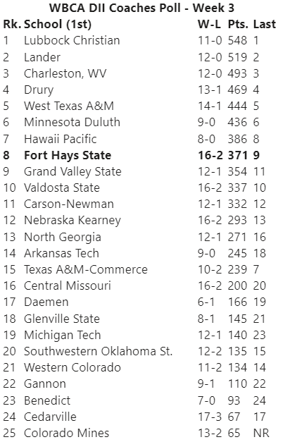 This is the third time in program history Fort Hays State is ranked eighth in the coaches poll. The Tigers wrapped up the 2014-15 season ranked eighth in the final WBCA poll of the year before winning a pair of home games against Missouri Western and Northwest Missouri State as the eighth-ranked team in the country in January 2019 (1/24-26/19).