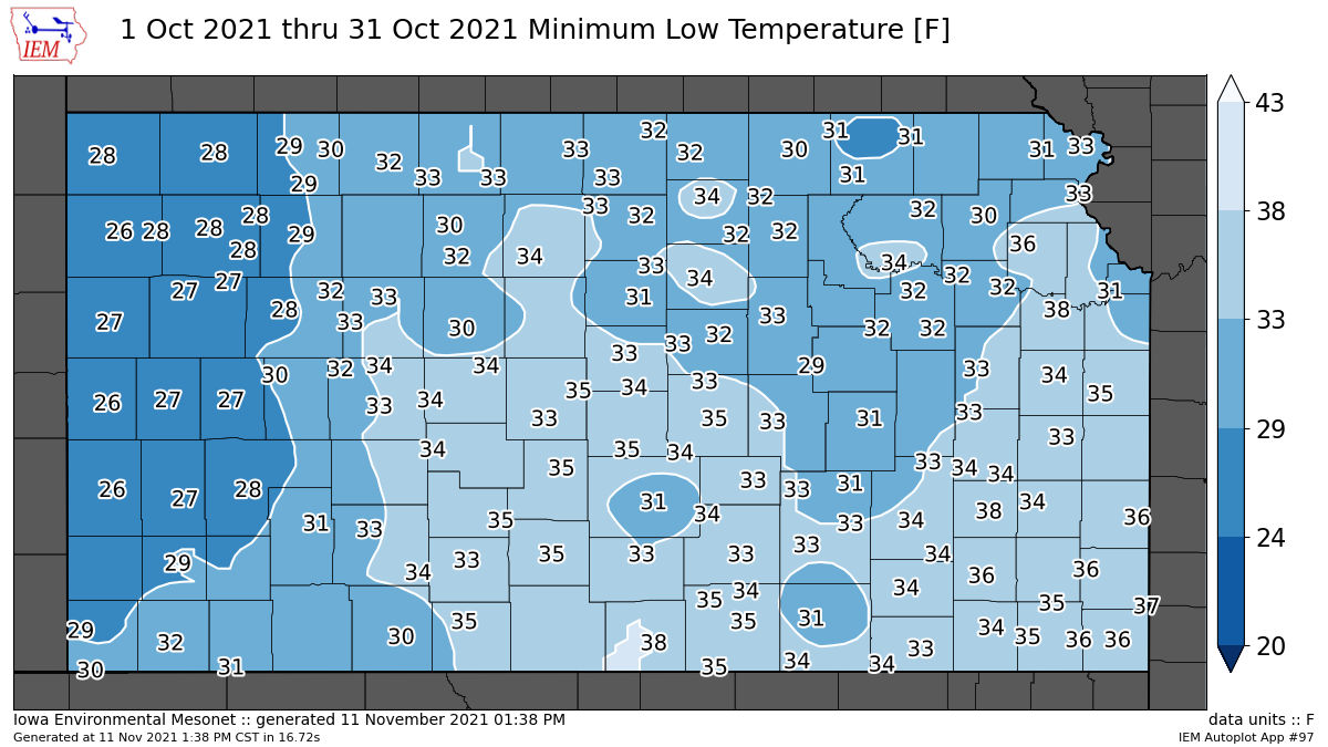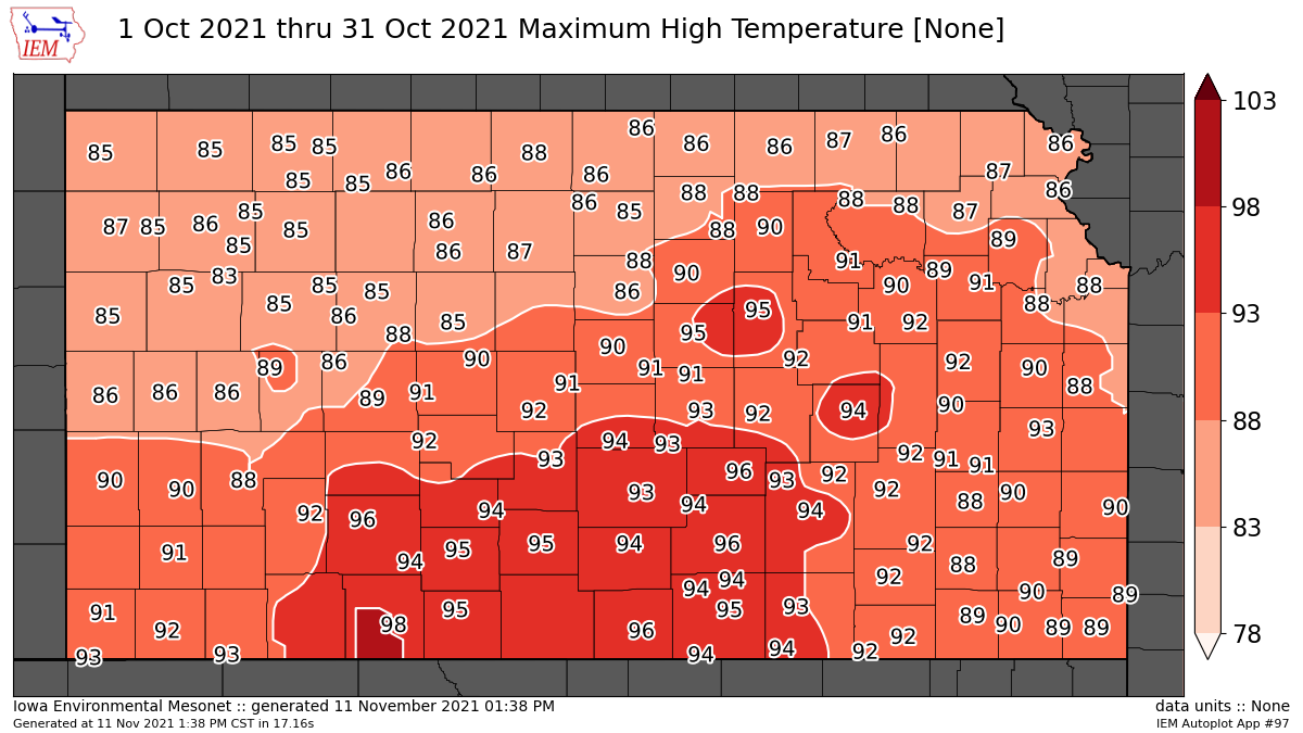 The highest temperature for the month was a scorching 95 degrees on Oct. 9, coming in just under the all-time high October temperature of 100 degrees on Oct. 3, 1954. Salina's October 2021 low temperature was 32 degrees on Oct. 16 and 30. The all-time October record low temperature was 13 degrees on Oct. 31, 2019.