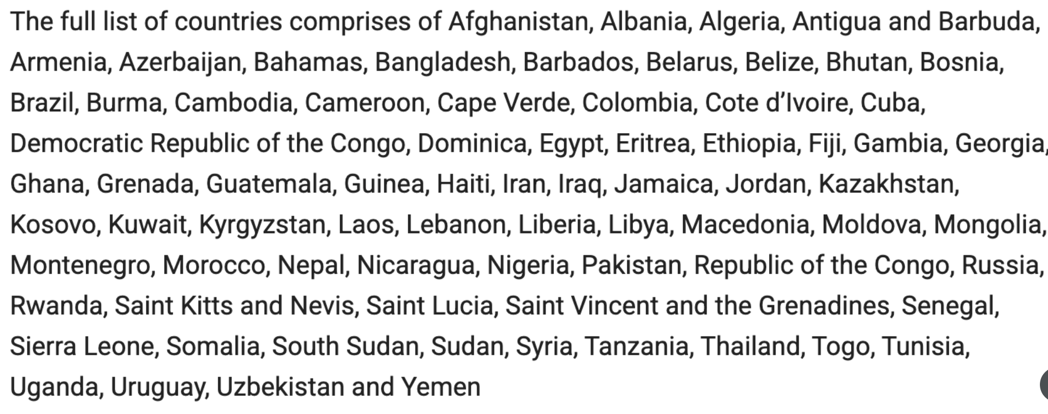 Afghanistan, Albania, Algeria, Antigua and Barbuda, Armenia, Azerbaijan, Bahamas, Bangladesh, Barbados, Belarus, Belize, Bhutan, Bosnia, Brazil, Burma, Cambodia, Cameroon, Cape Verde, Colombia, Congo, Cuba, Dominica, Egypt, Eritrea, Ethiopia, Fiji, Gambia, Georgia, Ghana, Grenada, Guatemala, Guinea, Haiti, Iran, Iraq, Ivory Coast, Jamaica, Jordan, Kazakhstan, Kosovo, Kuwait, Kyrgyzstan, Laos, Lebanon, Liberia, Libya, Macedonia, Moldova, Mongolia, Montenegro, Morocco, Nepal, Nicaragua, Nigeria, Pakistan, Republic of the Congo, Russia, Rwanda, Saint Kitts and Nevis, Saint Lucia, Saint Vincent and the Grenadines, Senegal, Sierra Leone, Somalia, South Sudan, Sudan, Syria, Tanzania, Thailand, Togo, Tunisia, Uganda, Uruguay, Uzbekistan and Yemen.