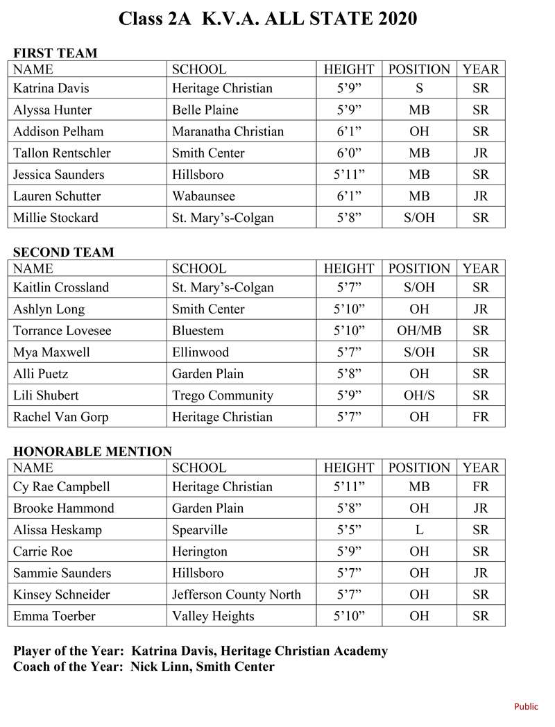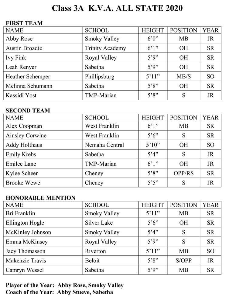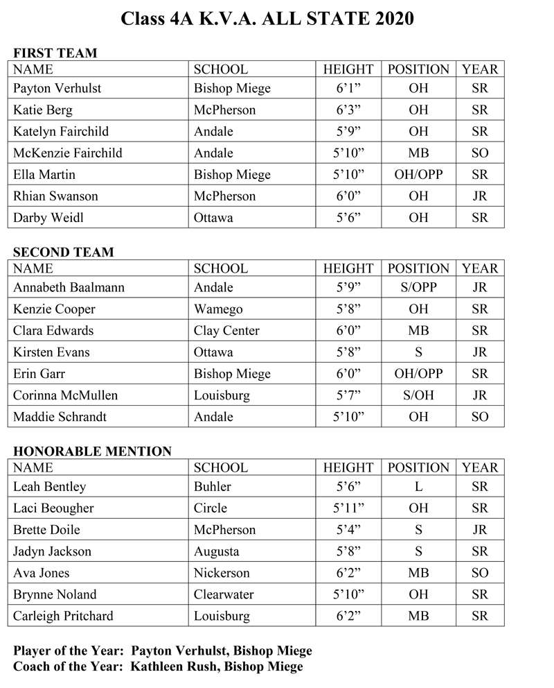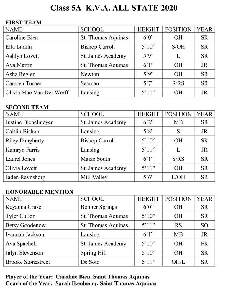 The Kansas Volleyball Association has announced the 2020 All-State Team, Players of the Year, and Coaches of the Year selections for all classifications.