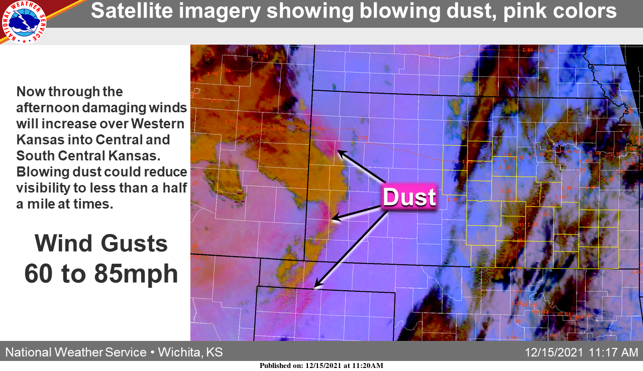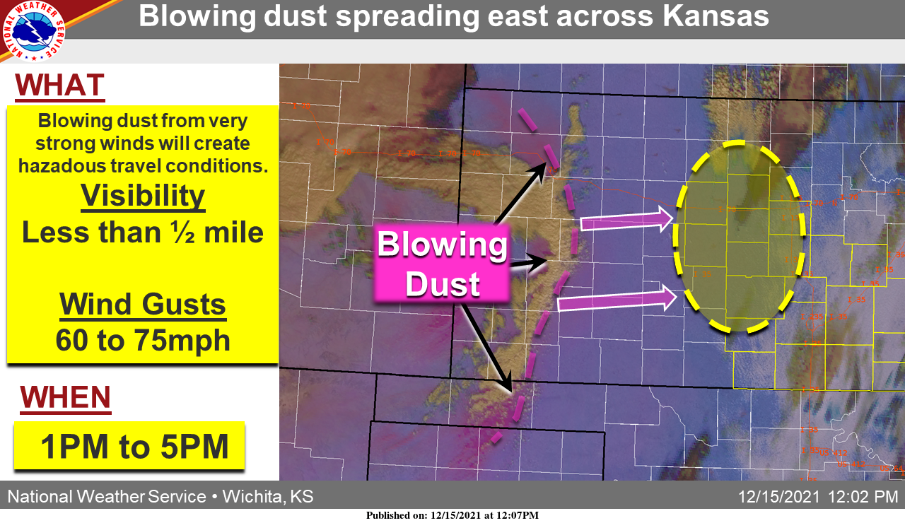 UPDATE 1:30 p.m. Wednesday: Blowing dust from damaging wind gusts will create hazardous travel conditions across central and parts of south-central Kansas, according to the National Weather Service.