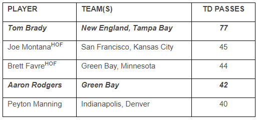 Brady and Rodgers rank first and fourth, respectively, among the NFL’s career postseason leaders in touchdown passes.