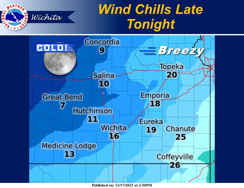 According to the National Weather Service in Wichita, a cold front moving through the area late tonight will bring cooler temperatures and breezy conditions. That, in turn, will cause much of the area to see wind chills in the teens and single digits late tonight through early tomorrow morning.