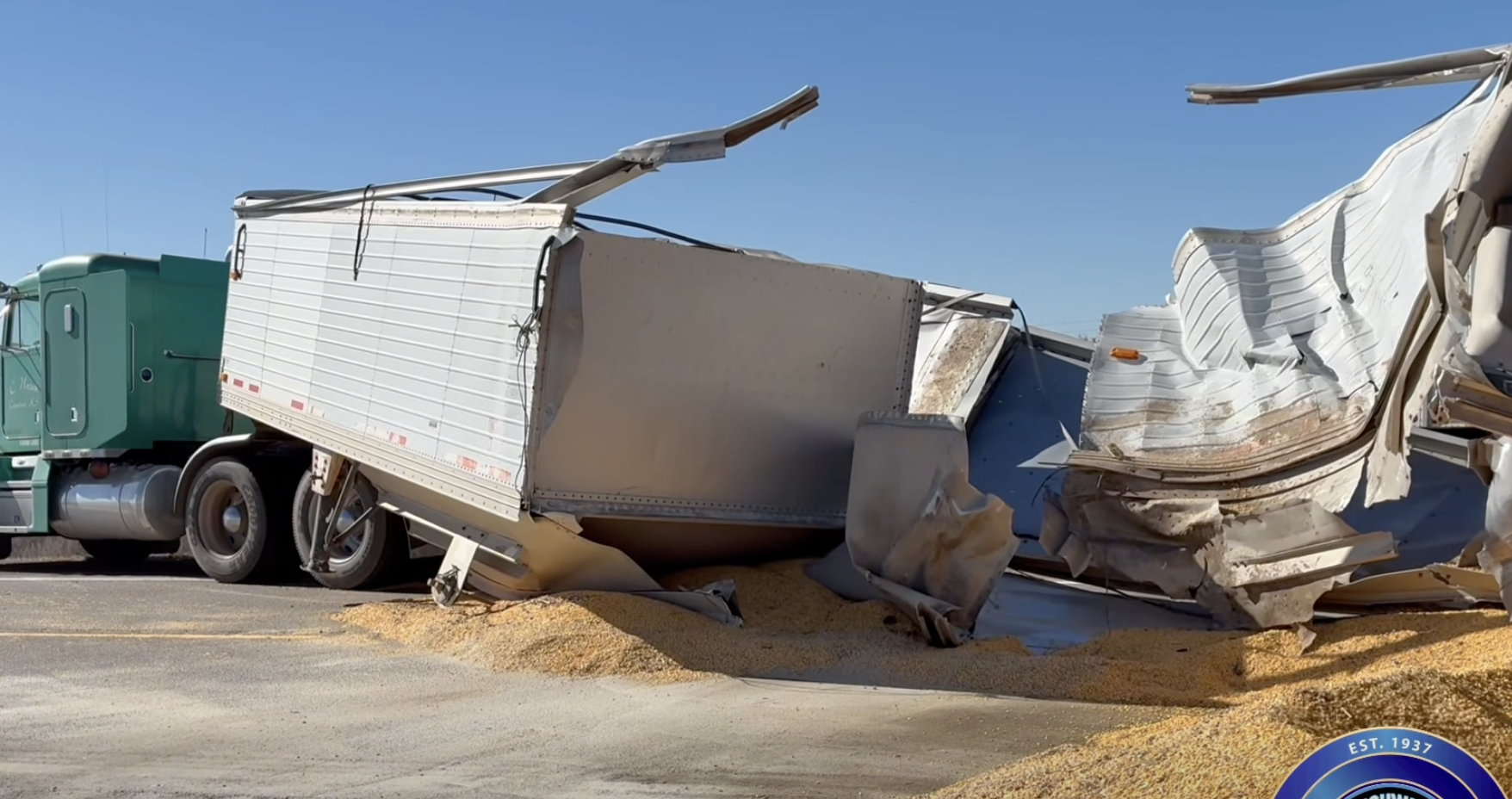 Both vehicles were removed and the grain spill was cleaned from the highway. One driver was transported for suspected minor injuries to a nearby hospital. Authorities released no additional details.