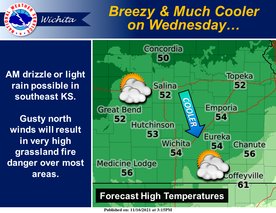 Gusty north winds will usher in much cooler air on Wednesday across central and eastern Kansas, according to the National Weather Service.