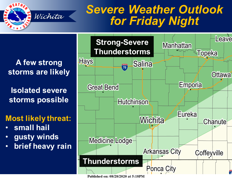 Storms are expected to develop between 9 p.m. and midnight in central Kansas and gradually spread south during the night, according to the National Weather Service (NWS) in Wichita.