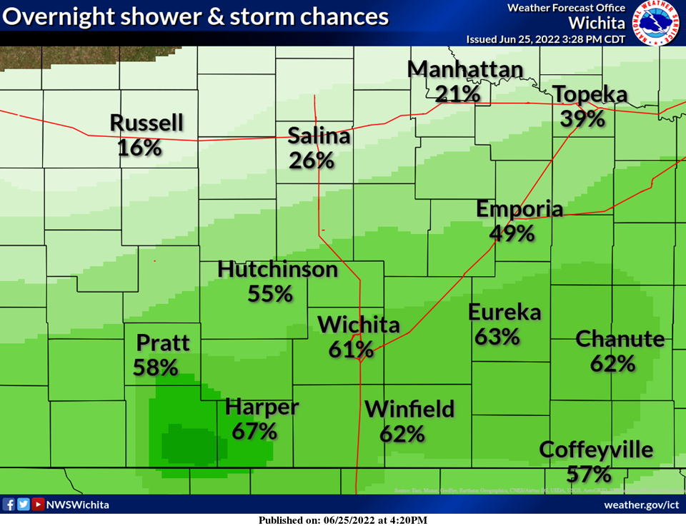 Chances for showers and thunderstorms will become likely across southern Kansas this evening and tonight.