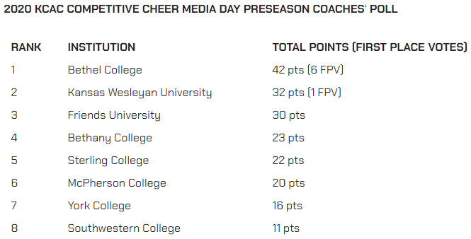 WICHITA — The Bethel College competitive cheer squad came out on top of the 2020 KCAC Competitive Cheer Preseason Coaches' Poll, the conference office announced Thursday.