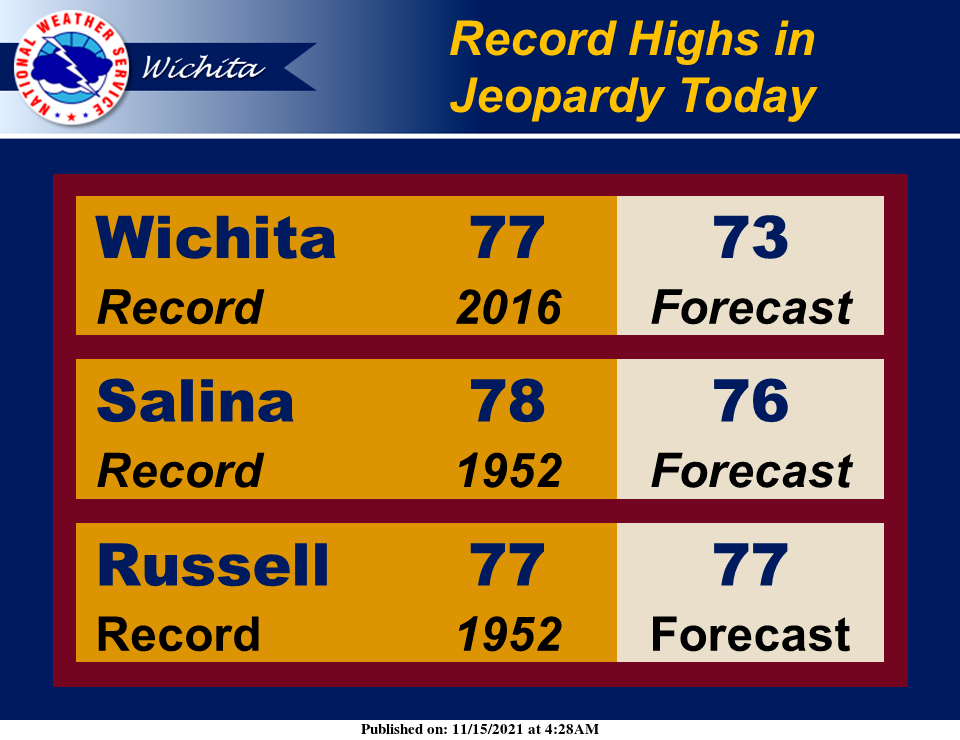 According to the National Weather Service in Wichita, temperatures are forecast to be in the 70s today, which may approach record levels for Nov. 15.