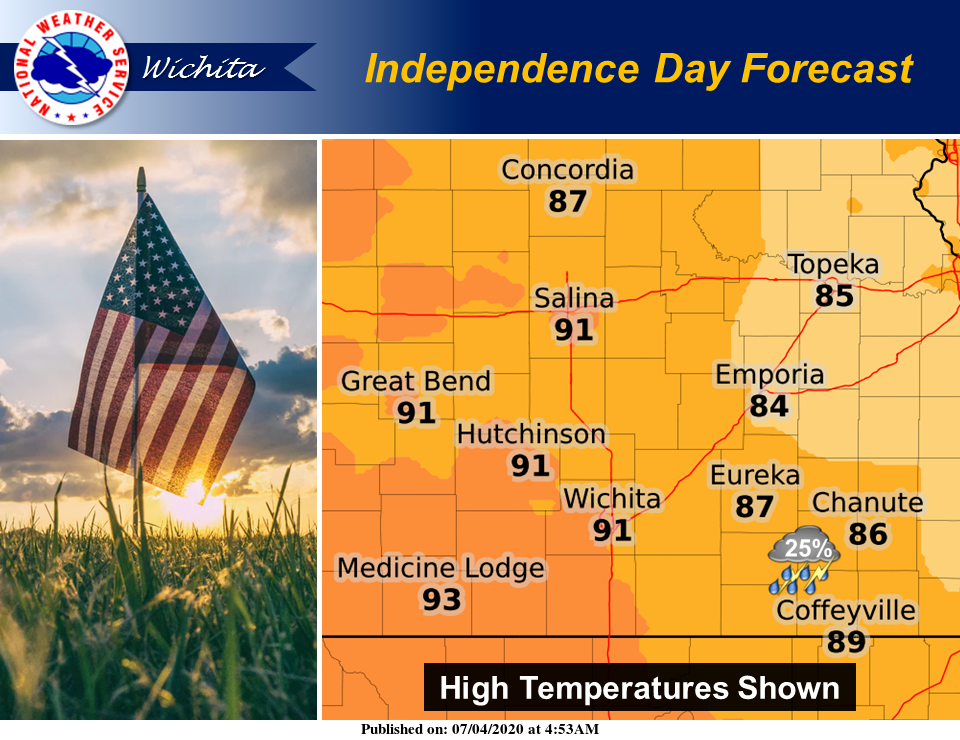 Near normal temperatures and partly sunny skies are expected on Saturday with highs in the upper 80s and lower 90s, according to the National Weather Service (NWS) in Wichita.
